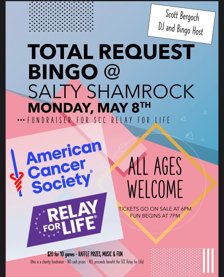 Salty Shamrock is partnering with The American Cancer Society for Charity Bingo and All request DJ night on Monday May 8th. All proceeds from bingo sales will benefit Relay for Life. Come out for raffles, bingo, music, and fun to help this great charity. Cards go on sale at 6pm with Bingo starting at 7pm.