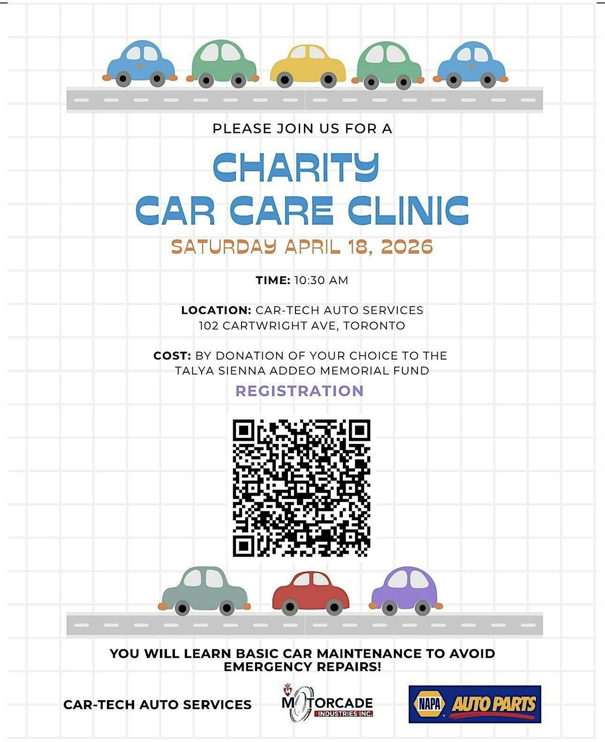 The Charity Car Care Clinic is being held to raise funds for the Talya Sienna Addeo Memorial Education Fund trusteed by the Jane Finch Centre. The funds will provide an opportunity for students within the Jane & Finch community to continue their education beyond highschool.