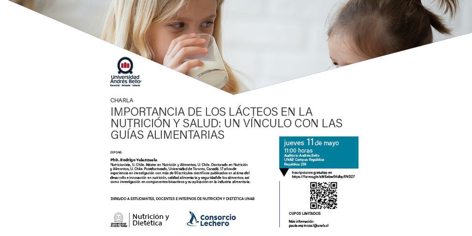 Más información ?? https://unab.me/3Lp4KfuLa carrera de Nutrición y Dietética de la Universidad Andrés Bello invita a la charla Importancia de los lácteos en la nutrición y salud: Un vínculo con las Guías Alimentarias, la cual se enfoca en presentar los hallazgos científicos ligados a la actualización de las Guías Basadas en Alimentos de Chile actualizadas en el 2022. Las nuevas guías resaltan el consumo de lácteos a lo largo del ciclo vital.