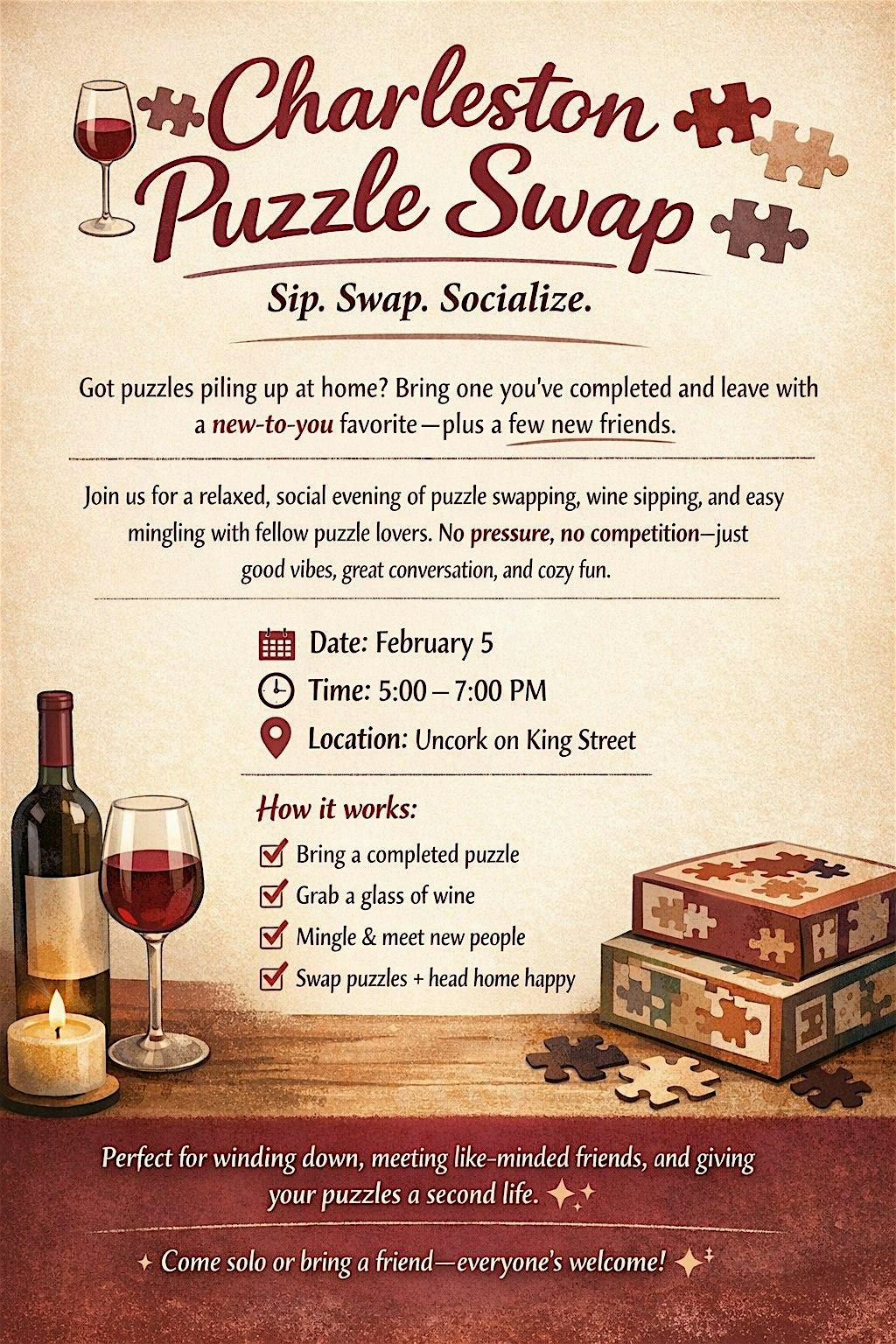 A cozy, social twist on game night! Charleston Puzzle Swap is where completed puzzles get a second life and new friendships come together. Guests bring a puzzle they’ve already finished, sip wine, mingle with fellow puzzle lovers, and swap boxes before heading home with a brand-new (to them) challenge. Think low-pressure networking, good conversation, and the simple joy of unwinding, one puzzle and one glass at a time. 🧩🍷