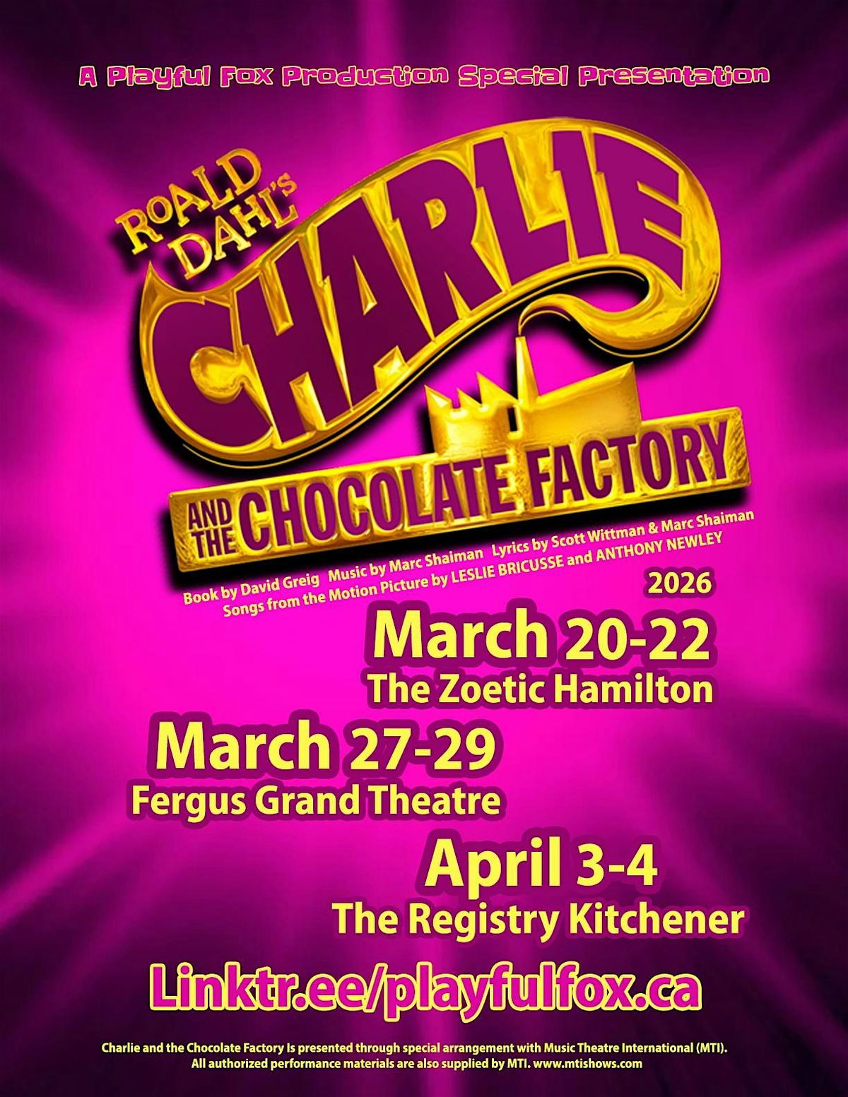 After their highly praised production last year at The Sanderson Centre, Playful Fox Productions invites you to enter a world of Pure Imagination with Charlie and the Chocolate Factory - The Broadway Musical!