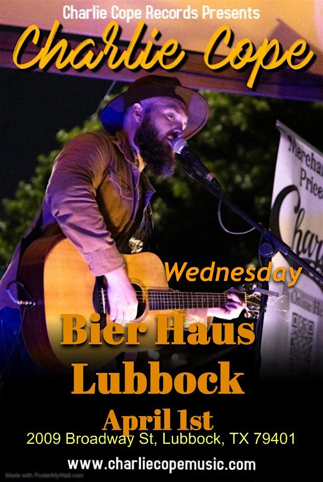 Bier Haus Lubbock hosts Charlie Cope live in Lubbock on April 1. A stripped-down acoustic set built on songwriting, storytelling, and connection — the kind of show you feel, not just hear.
