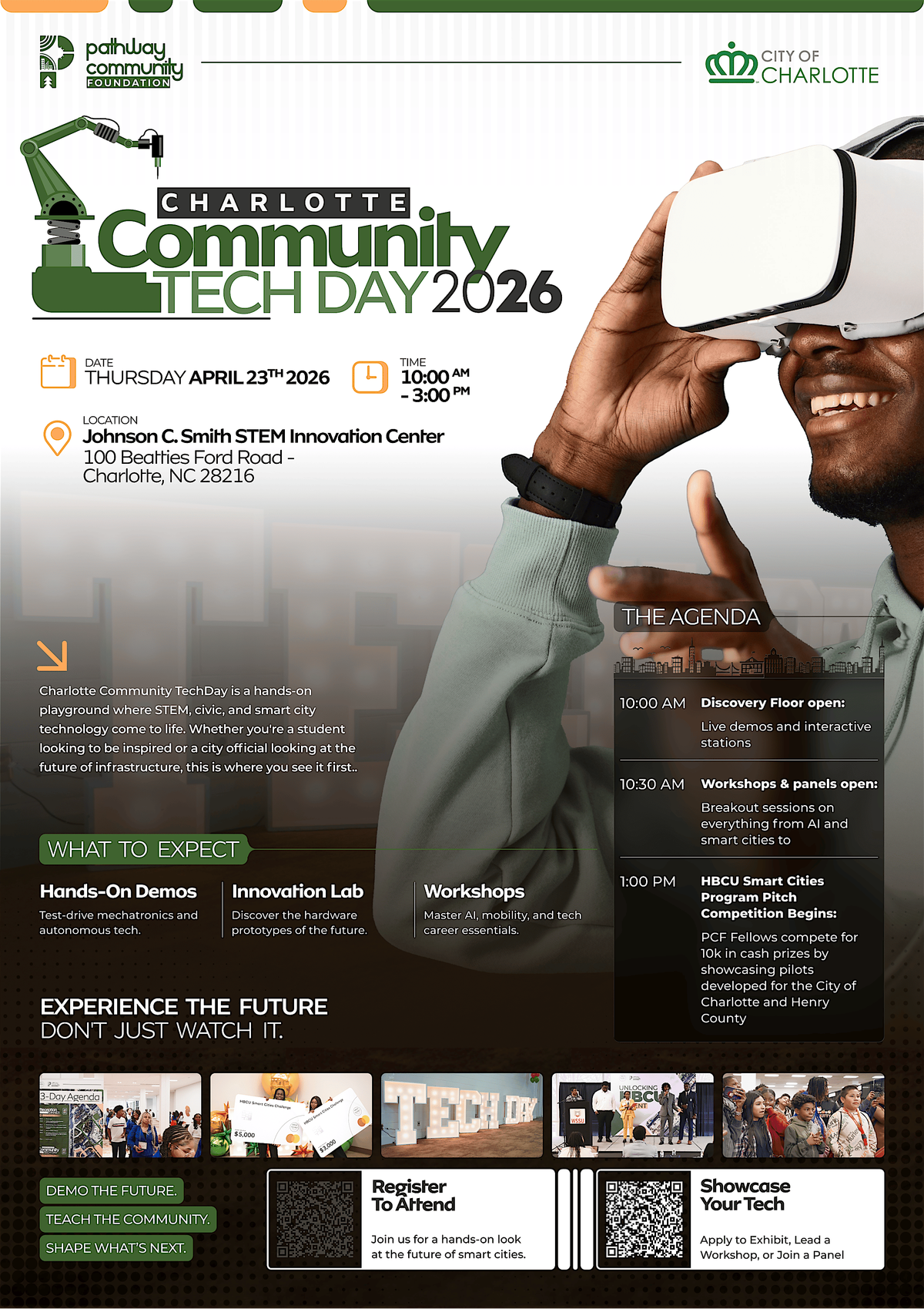 Charlotte Community TechDay is where technology moves off the screen and into real life. Hosted by the City of Charlotte and Pathway Community Foundation, this one-day experience transforms Johnson C. Smith Universityβs Innovation Center into an interactive hub of discovery β featuring live demos, drones, STEM workshops, VR, smart city exhibits, and startup-style presentations.