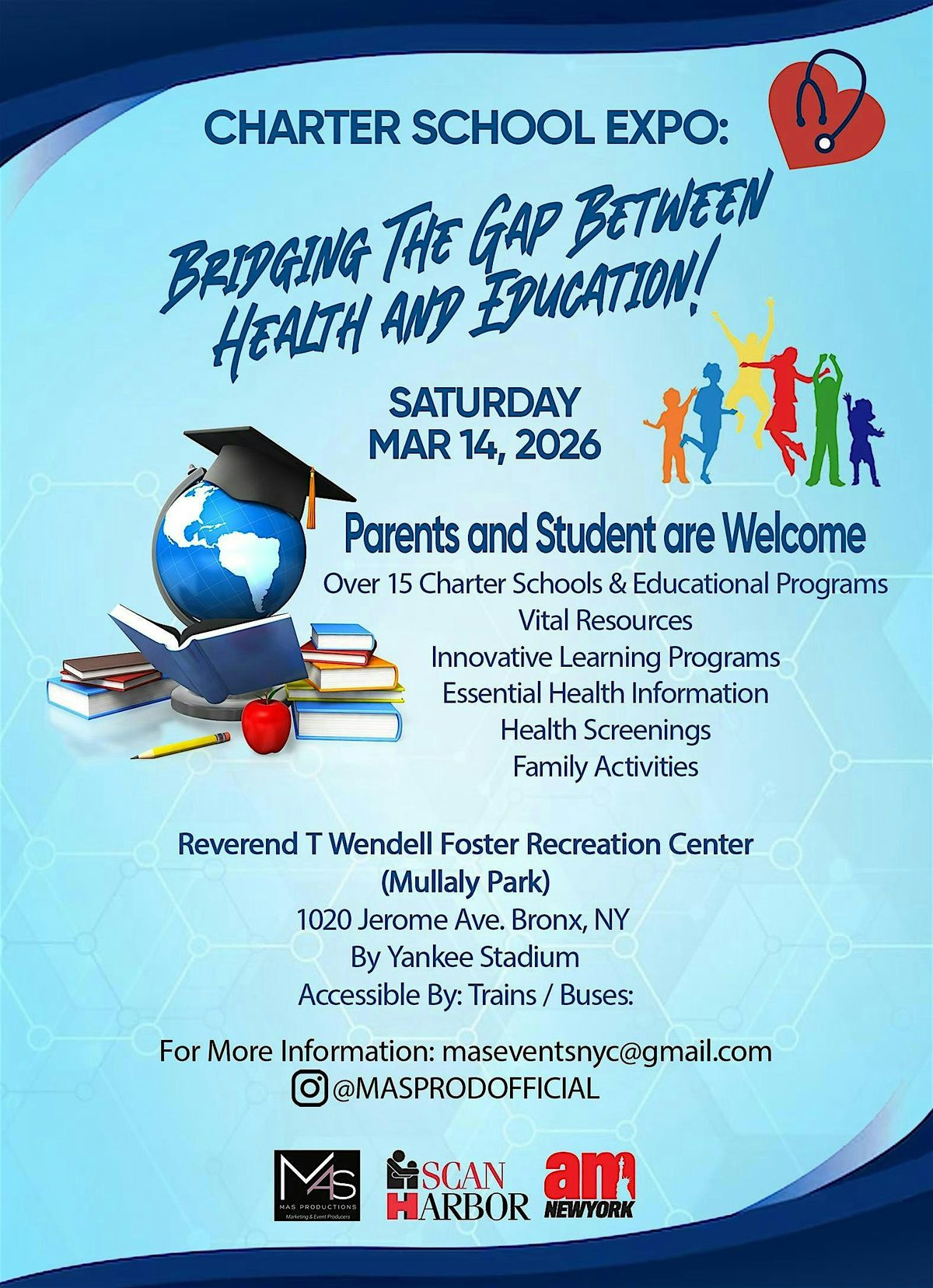 Join us at the Charter School Expo on March 14th! Parents and families, discover over 15 top charter schools, vital health resources, and fun family activities—all in one place. There will be a photo booth, music, face painting and more! Charter schools and educational programs, this is your chance to connect with the community and showcase your innovative learning opportunities. Don’t miss out on bridging the gap between health and education at the Reverend T Wendell Foster Recreation Center in the Bronx!