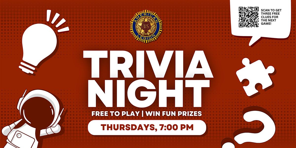 Join us for free live trivia every Thursday at 7pm at American Legion Post 95 in Chattanooga, TN! Free to play, and top teams win fun prizes!