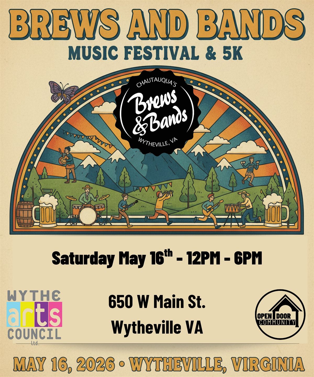 We're ready to do it again on Saturday, May 16, for Wythe Arts Council's Annual Brews & Bands! We are once again partnering with Open Door Cafe and the Fast & Fiorini 5 K. Sample craft beers while cheering on your favorite local band as they compete for our "Band of the Year." Food and non-alcoholic beverages will be available all day through Open Door Cafe. Bring your lawn chair for this family friendly event.
