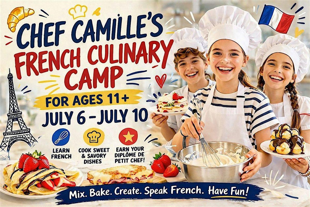 Join Chef Camille for an unforgettable week of French cooking, where teens (ages 11 and up) will master both sweet and savory recipes, learn real kitchen skills, and discover French language and culture, all in a fun, hands-on environment!