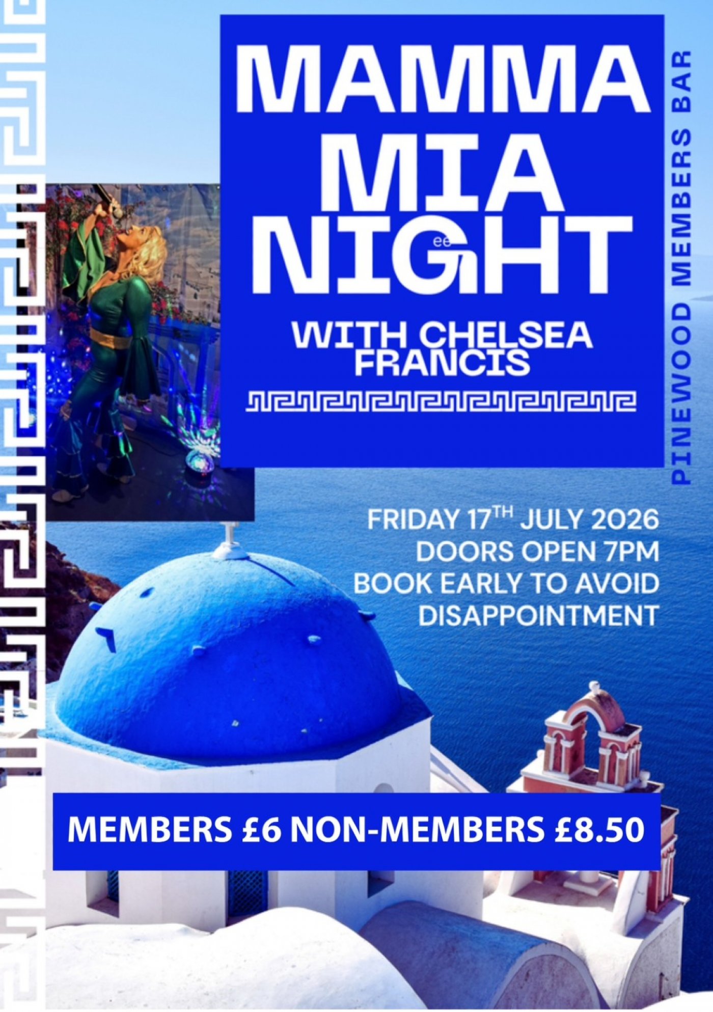 Don't miss out on this spectacular musical extravaganza! Secure your tickets for Chelsea Francis Live Mamma Mia Night now members of Pinewood Community Hall can grab theirs for £6, while non-members can join the fun for £8.50.