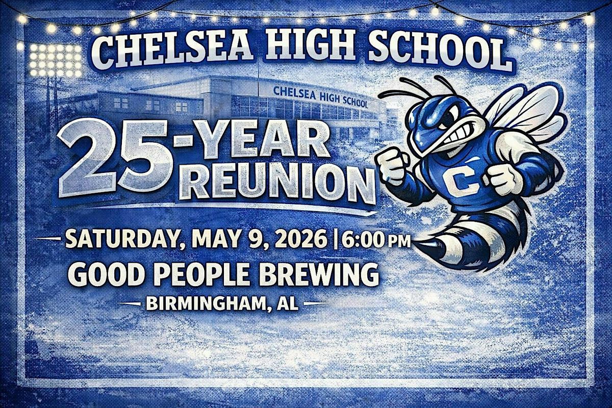 Hey there, Chelsea High School Class of 2001! It's time to catch up and celebrate 25 years since we tossed those caps in the air. Join us in person for an unforgettable night of laughter, memories, and reconnecting with old friends. Don't miss out on this chance to see familiar faces and make new memories together. Can't wait to see you there!