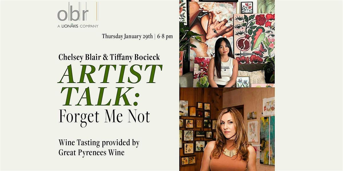 Meet the artist! Join Chelsey Blair and Tiffany Bociek in person to learn more about the inpsiration for the exhibition: Forget Me Not. Join them for a gallery walk through, dive deep into their creative process, hear stories behind the art, and take part in a Q&A.