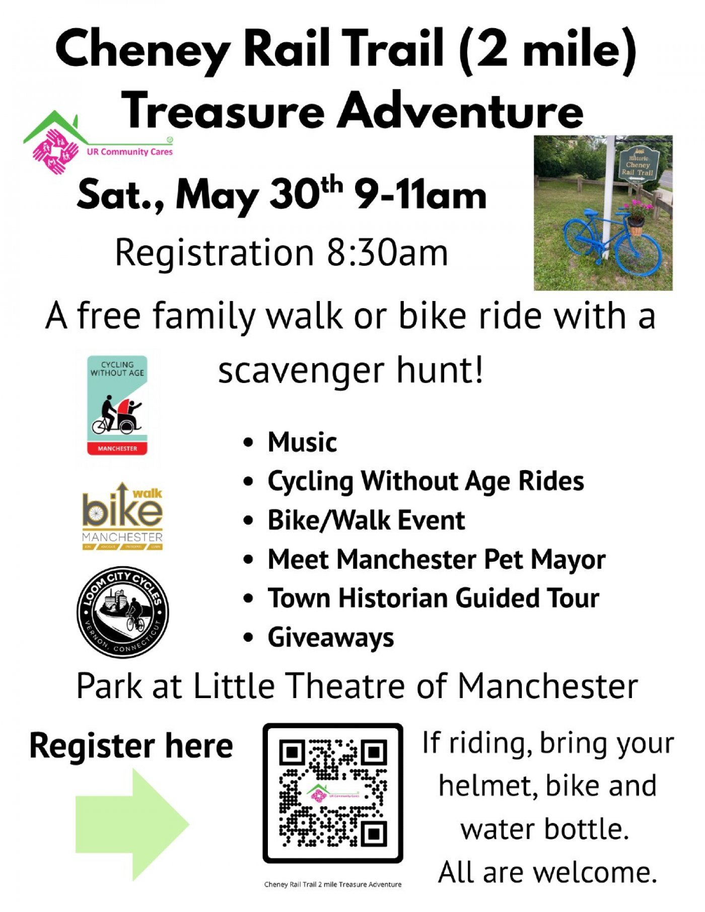 The event will feature a wide range of vendors, activities, and community partners, including a DJ; Bike 4 All; Watch For Me CT; Loom City Cycles; Bike Walk Manchester; Bike Bolton and Mansfield, Cycling Without Age Manchester; Women on Wheels; Susan Barlow’s History Walk; a Doodlegram Card Making Station; Manchester's Pet Mayor Tito; TOMS Coffee Truck; AMS; Bike Walk CT; Connecticut Department of Transportation (CT DOT); and Change the Script, all coming together to share resources, activities, and opportunities that promote health, movement, creativity, and community connection.