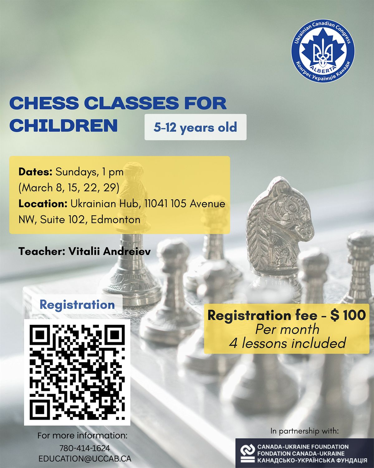Ukrainian Canadian Congress – Alberta Provincial Council (UCC-APC) invites children ages 5–12 to join small-group chess classes at the Ukrainian Hub in Edmonton.