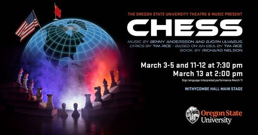 Chess, the musical, will run on the Withycombe Hall Main Stage (2901 SW Campus Way) March 3-5 and 11-12 at 7:30 pm and March 13 at 2:00 pm (sign language interpreted performance March 11). Tickets for all University Theatre productions are complimentary in Winter 2022 and can be reserved at https://oregonstatecla.universitytickets.com/Originally premiering on Broadway in 1988, Chess is a rock musical written by ABBA superstars Benny Andersson and Björn Ulvaeus with lyrics by Tim Rice, that tells the human side of the fraught relationship between the United States and Soviet Union during the Cold War. In 1956, Florence, an orphaned Hungarian refugee, was sent to the United States and raised as an American. Thirty-years later, Florence finds herself as the “second” to the cocky American chess Grand Master, Freddie, in his quest to defeat his Russian rival, Anatoly. Featuring bold power-ballads and catchy 1980s bangers including radio hit “One Night in Bangkok,” Chess captures the emotional tension and absurdity of the era. “The show is a wild ride,” comments director Elizabeth Helman, “the story really explores how the political and personal collide in a moving way.”