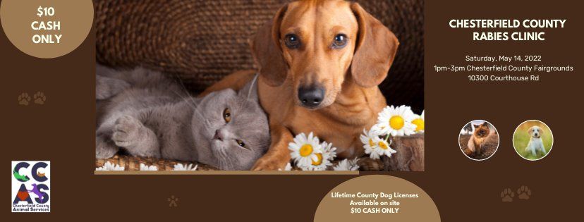 Join us for our 2022 Rabies Clinic at the Chesterfield County Fairgrounds! Open to dogs and cats. Dogs must be on a leash and cats need to be in a carrier. Rabies vaccines are $10. $10 Lifetime Dog Licenses will be sold on site as well. CASH ONLY EVENT