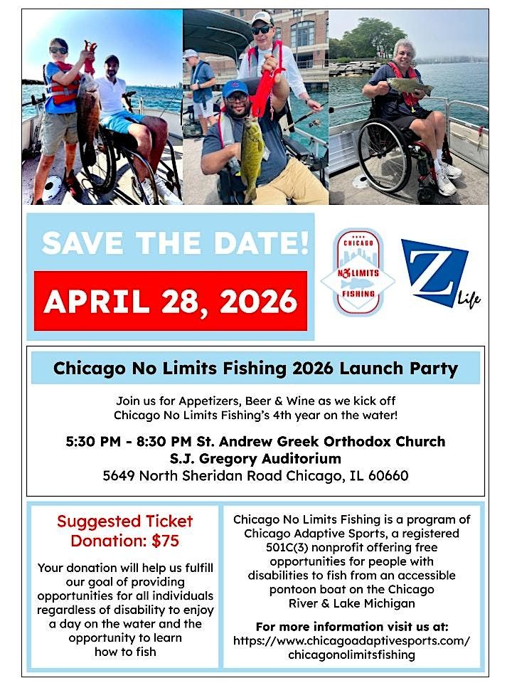 Come enjoy appetizers, beer, and wine as we kick off another incredible season of Chicago No Limits Fishing! Join us at S.J. Gregory Auditorium at St. Andrew’s Greek Orthodox Church for a fun-filled evening celebrating our mission to provide inclusive fishing and boating experiences for individuals with disabilities.
