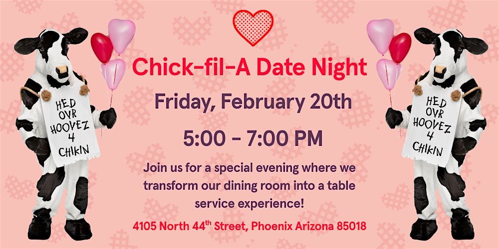 Looking for a fun way to spend the evening? Join us at Chick-fil-A Arcadia for an awesome Date Night where our dining room will be transformed into a table service experience for you & your loved one(s)!