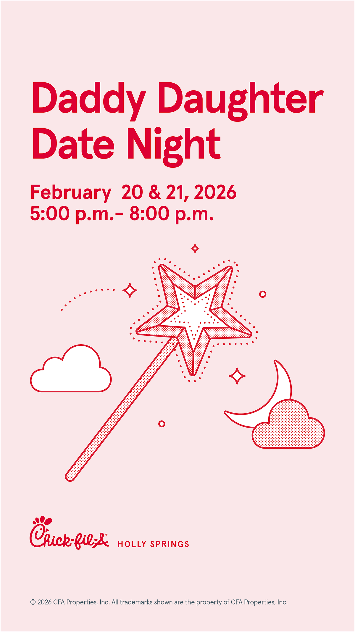 We are so excited to welcome you to Chick-fil-A Holly Springs for a special date night with your daughter(s). We are hosting this event over two nights in February (Feb. 20th & 21st), with two time slots available each day (5-6pm & 6-7pm). Please only select one date and one time slot. When reserving your spot with us, please select only one ticket. On the ticket order form you will be able to let us know how many children will be accompanying you so we can ensure adequate seating. We can't wait to see you there!