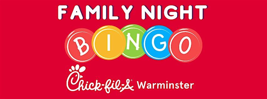 Join us at Chick-fil-A Warminster for an evening filled with family time, some laughter and bingo. Many chances to win some amazing CFA prizes. This is open to all ages. This is a free event which requires a ticket for each person attending.
