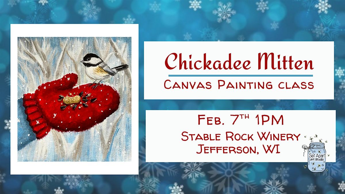 Welcome to the **Chickadee Mitten Canvas Painting Class** happening at **Stable Rock Winery, Distillery & Kitchen** on **February 7, 2026 at 1:00 PM**