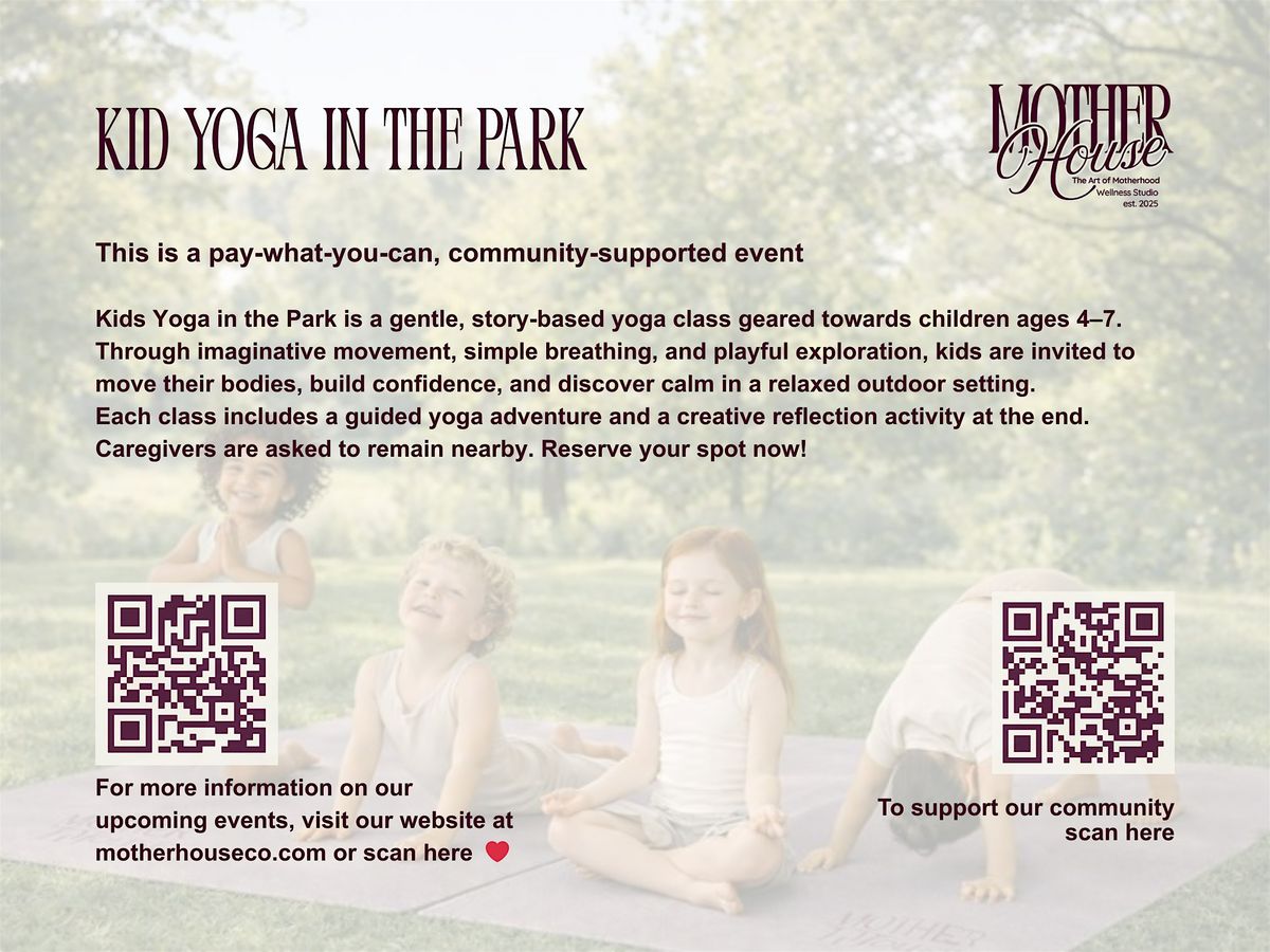 Kids Yoga in the Park is a gentle, story-based yoga class geared towards children ages 4–7. Through imaginative movement, simple breathing, and playful exploration, kids are invited to move their bodies, build confidence, and discover calm in a relaxed outdoor setting.