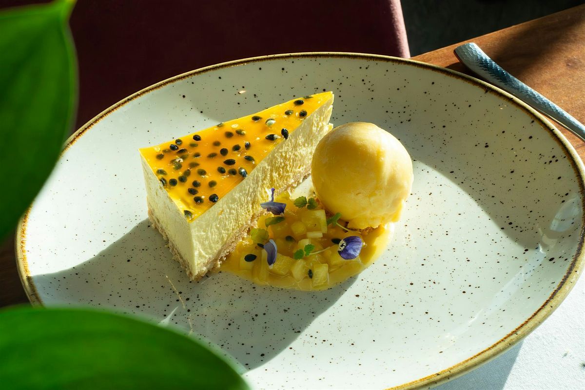 Dessert Lychee & Passionfruit Cheesecake pineapple and vanilla seed compote, coconut ice cream.