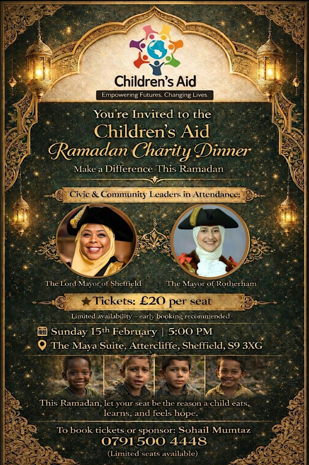 Children’s Aid will host a Ramadan Charity Dinner on Sunday 15th February at 5:00pm at The Maya Suite, Attercliffe, Sheffield, S9 3XG