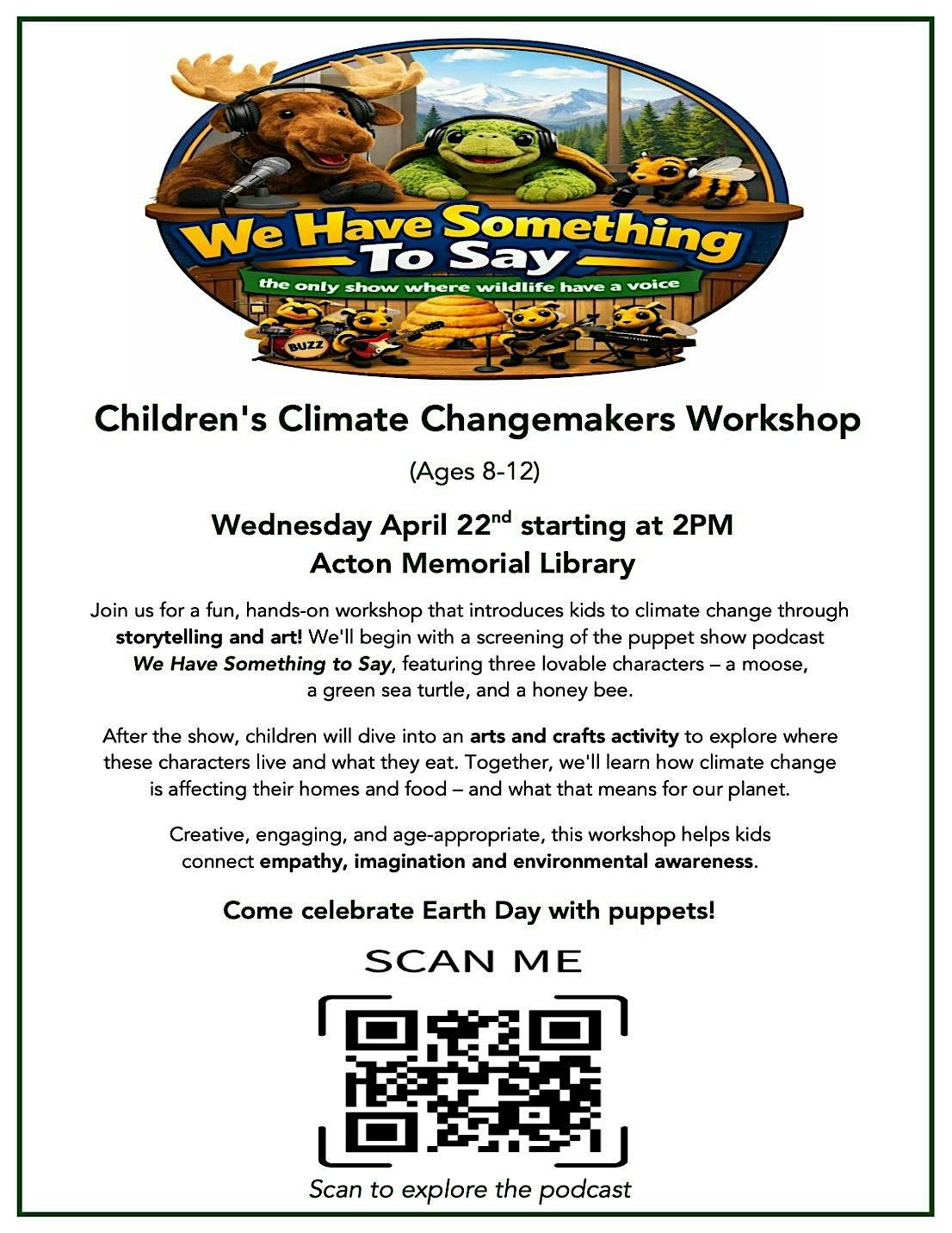 The workshop starts with the premiere screening of the puppet podcast "We Have Something to Say" followed by a station rotation activity where kids will learn where the characters from the show live and what they eat. Kids will predict where characters might move and how their diets might change due to climate change.