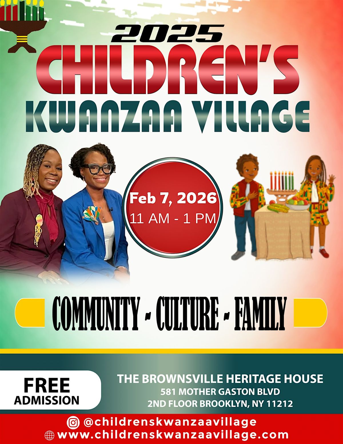 Welcome to the Children's Kwanzaa Village event! Join us at Brownsville Heritage House Inc on February 7, 2026 at 11:00 AM for a day filled with joy and celebration. Let's come together to honor African heritage and culture through various activities and performances. This event is a great opportunity for children to learn about the principles of Kwanzaa in a fun and interactive way. Don't miss out on this special occasion to create lasting memories with your family and friends. See you there!