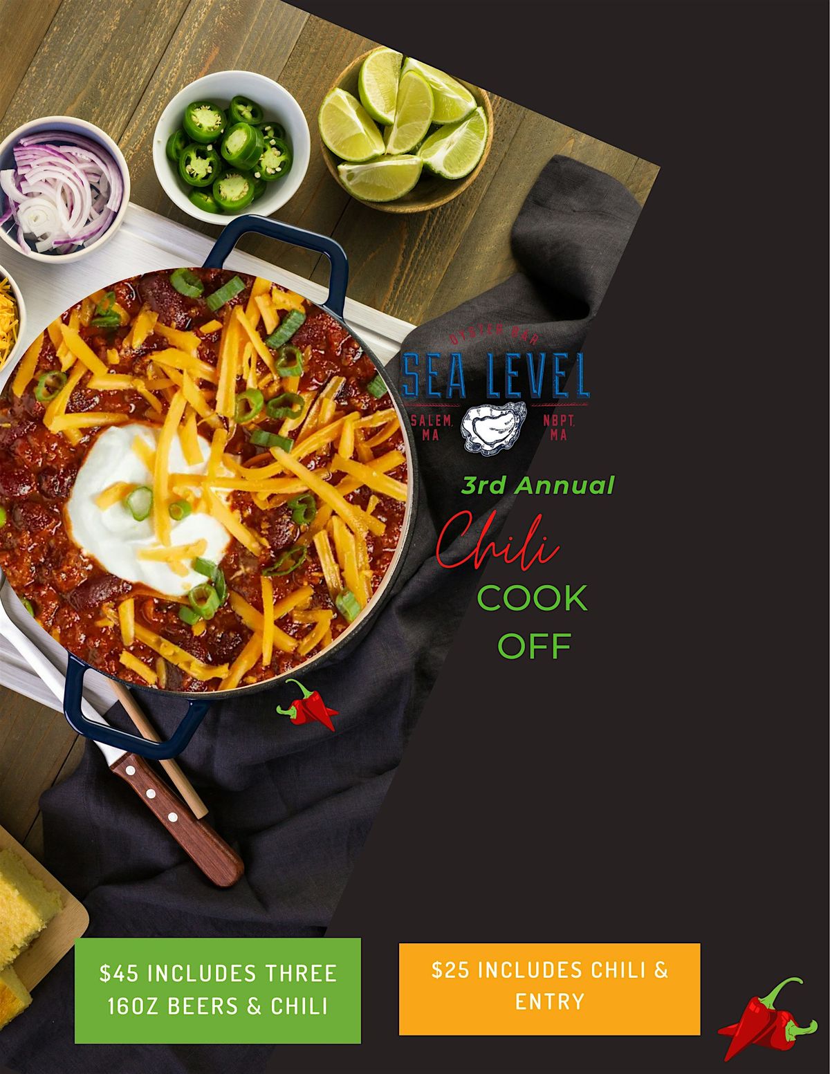 Chili competitors include : Sea Level Oyster Bar Salem, Finz Seafood and Grill, The Landing, Trade House, Mercy Tavern, Longboards, The Salem Fire Department last years Champion Village Tavern!