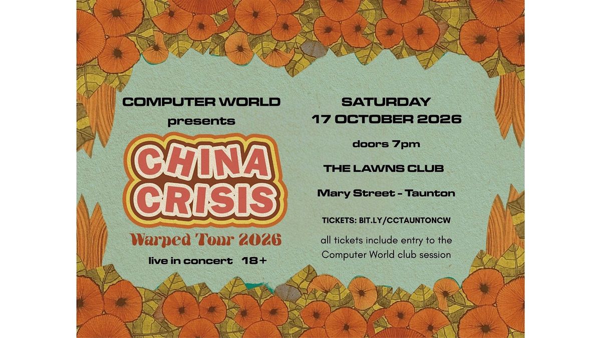 Doors open at 7pm. There will be no support act. China Crisis will take to the stage at around 8pm (subject to change), performing two sets, with a brief intermission. The Computer World club session will follow the China Crisis show, running through until 1am, entry to which is included in the ticket price.