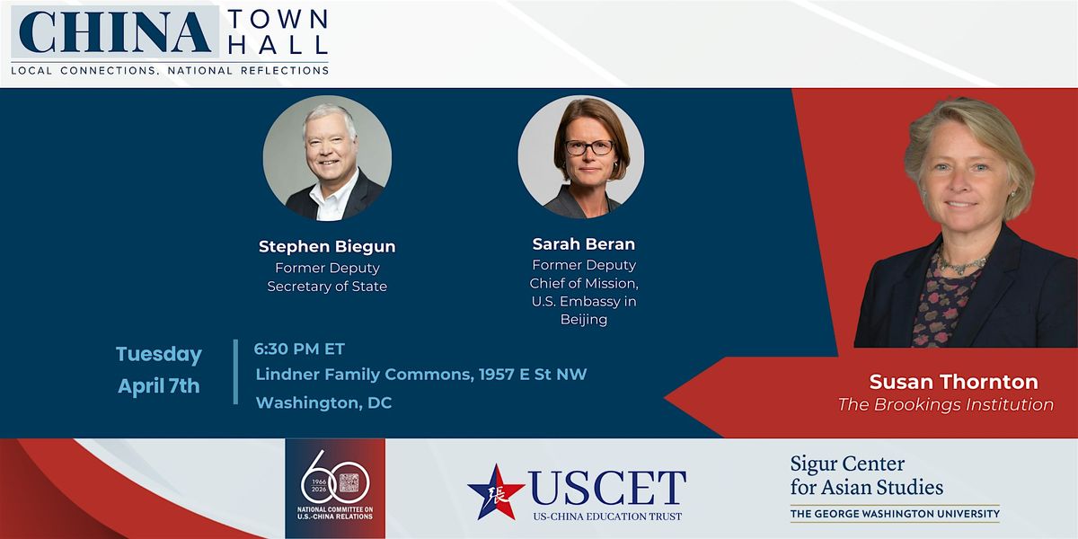 The 2026 CHINA Town Hall program will take place with two veteran senior diplomats discussing the current state and future trajectory of the U.S.-China relationship: Stephen Biegun, former U.S. deputy secretary of state, and Sarah Beran, former deputy chief of mission at the U.S. Embassy in Beijing and former senior director for China and Taiwan affairs at the White House National Security Council.