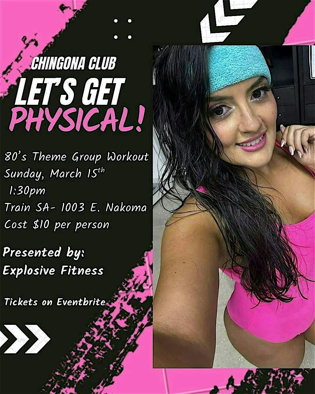 Get ready to sweat it out in a fun themed workout! This in-person workout session with Samantha Najera is all about fun vibes, nostalgic music, and pushing your limits. Whether you're a gym newbie or a workout warrior, come join the Chingona Club and have a great time! Led by Professional Trainer Jorge Vela of Explosive Fitness. There will also be giveaways! Bring your own water and bring a friend! $10 online or $10 per person at the door. (Online recommended for RSVP)