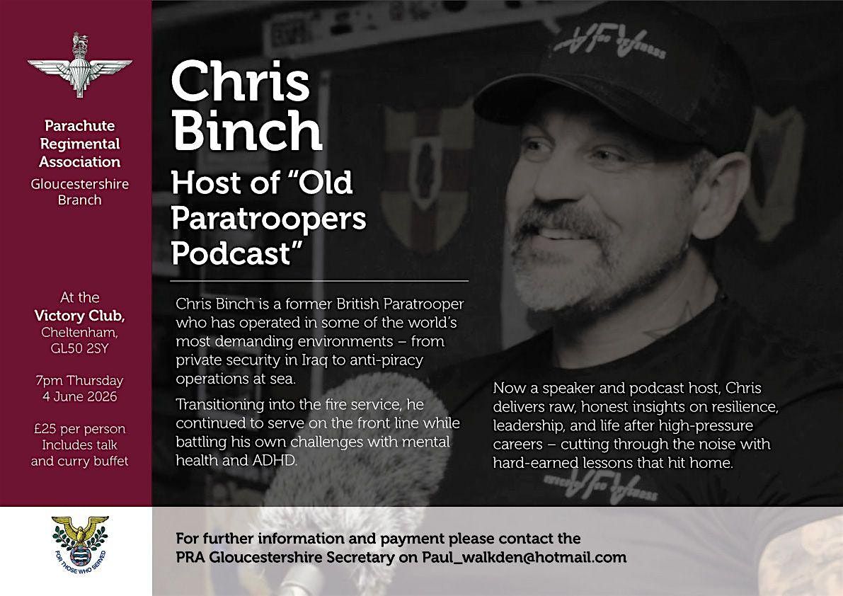 Join us for an evening talk with Chris Binch, a former British Paratrooper, as well as a curry buffet afterwards.