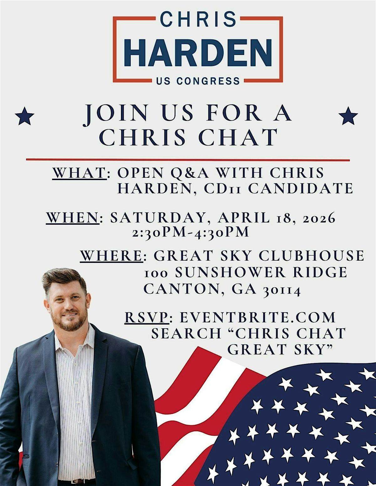 Join the community members of Great Sky and Laurel Canyon in an informal Q&A with Chris Harden, your candidate for Congressional District 11