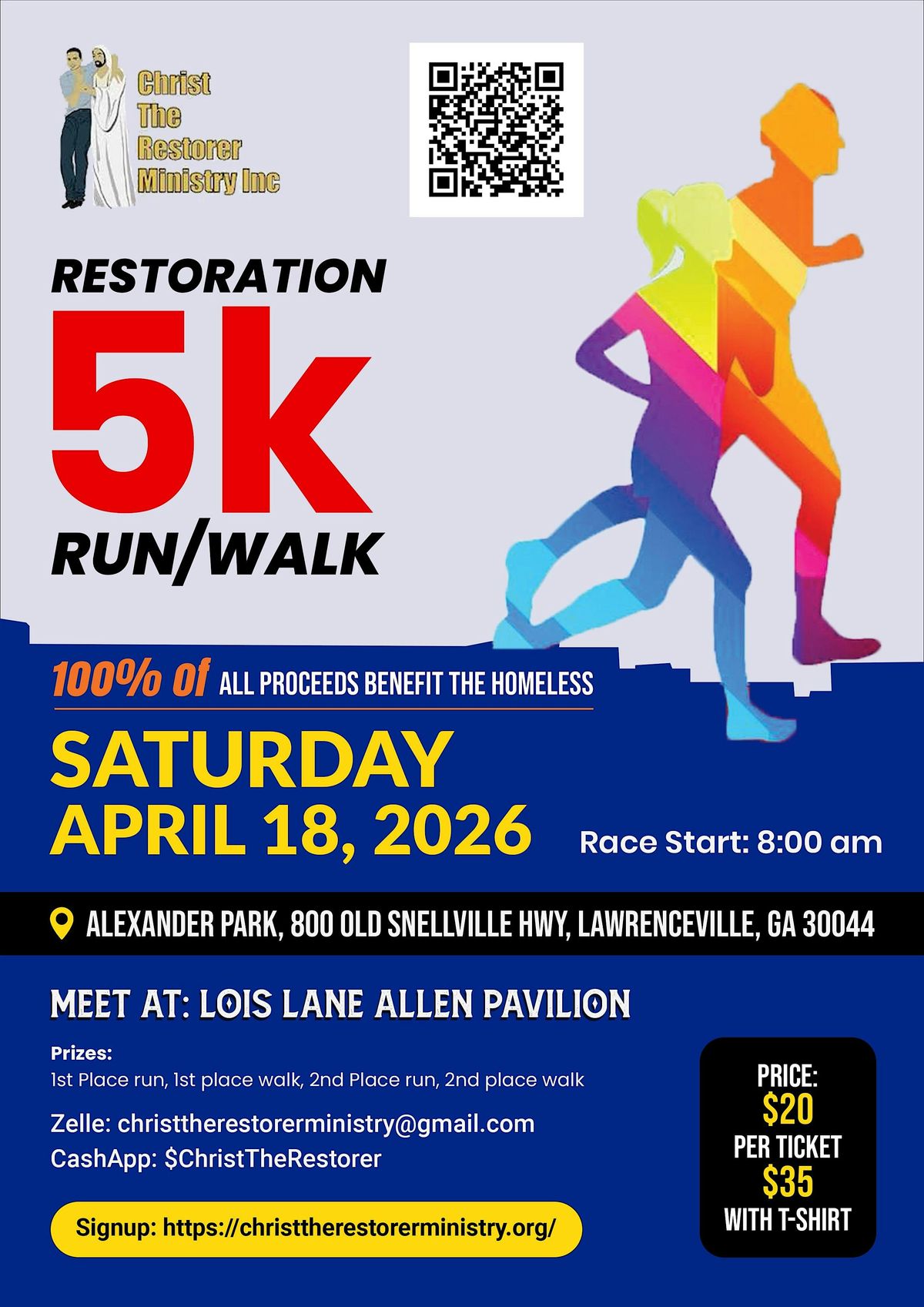 Christ The Restorer Ministry is a nonprofit organization dedicated to restoring the lives of the homeless in Gwinnett County and the Metro Atlanta area. Our ministry also strives to prevent homelessness for all! Join us for a fun-filled day at our Restoration 5k Run/Walk event on April 18, 2026! Lace up your sneakers and get ready to hit the trails at Alexander Park, 800 Old Snellville HWY at the Lois Lane Allen Pavilion. Whether you're a seasoned runner or just looking for a leisurely walk, this event is perfect for all fitness levels. Enjoy the beautiful scenery and fresh air as you make your way through the course. Don't miss out on this opportunity to get active, have fun, and support a great cause. 100% of the proceeds benefit the homeless! Tickets will be $20 to enter the race up until the start of the event. If you would like a t-shirt, tickets will be $35 to enter the race and receive a t-shirt. Ticket sales will close 2 days before the event. If you are purchasing a t-shirt, please leave your size next to your name upon signing up. Fruits and refreshments will be provided. See you there!