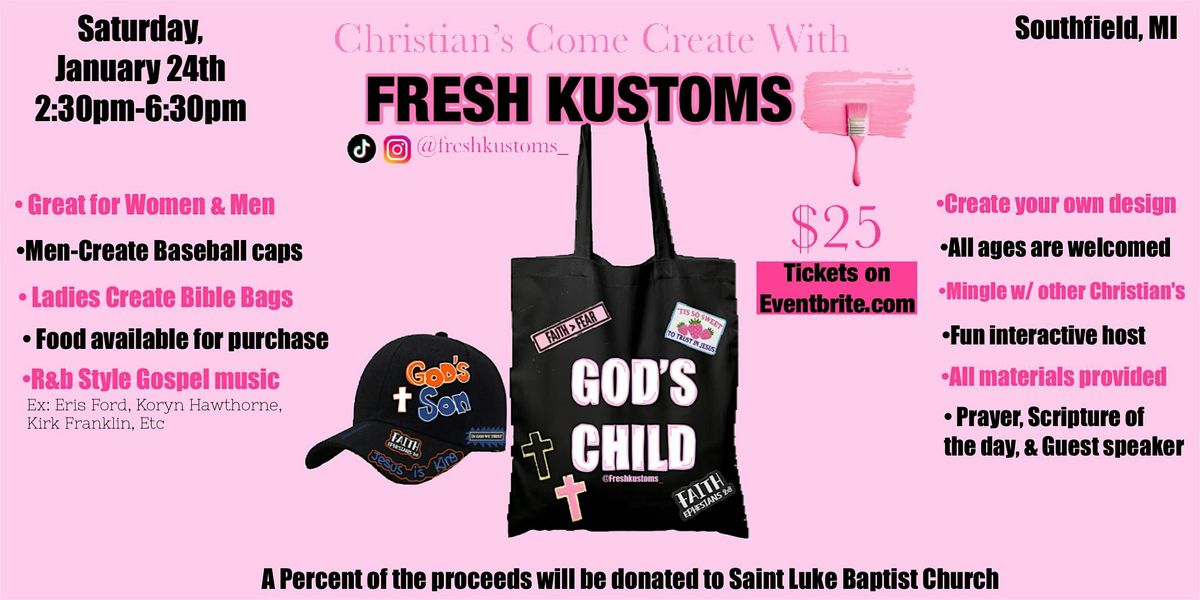 Welcome to Christians Create - Art Workshop W/ Fresh Kustoms happening in Southfield, MI on January 24, 2026 at 2:30 PM. Get ready for a day filled with creativity and inspiration! Join us for an exciting workshop where you can unleash your artistic side and create beautiful pieces with the guidance of Fresh Kustoms. Whether you're a beginner or an experienced artist, this event is perfect for anyone looking to explore their creative talents. Don't miss out on this opportunity to connect with fellow Christians and express yourself through art. See you there!