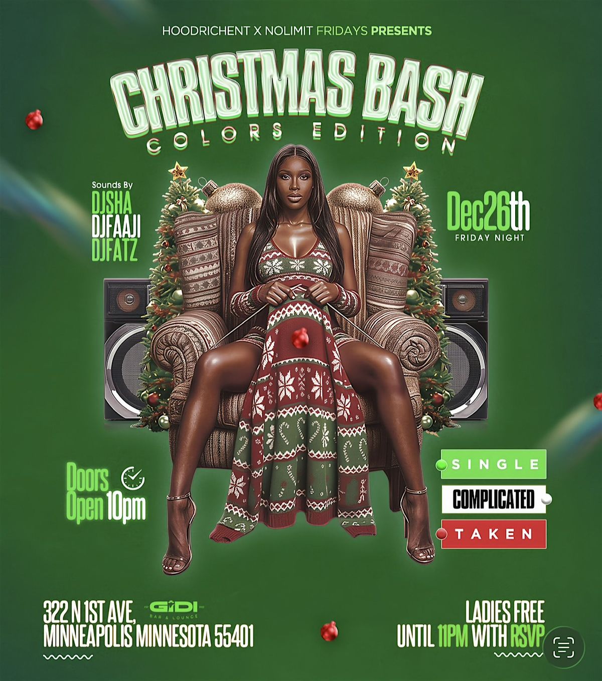 Holiday season is upon us, and we are starting the vibes with Christmas Colors Edition with Hoodrich Ent. Friday the 26th, we’re taking you on a musical journey from Afrobeats to R&B to Hip-Hop with Dj Fatz, Dj Sha and Dj Faaji on set! . Our top-tier DJs are set to ignite the dancefloor, bringing pure and nonstop energy. Don’t miss out on a night of unforgettable moments!