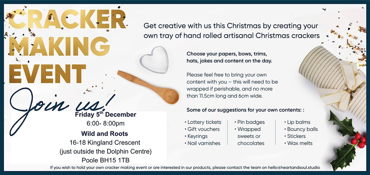 Come join us at Wild and Roots Greenery, just outside the Dolphin Centre in Poole, to make a tray of 6 13" handrolled artisanal Christmas Crackers.