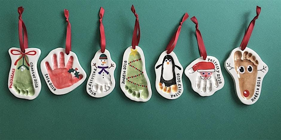 Join us, Poppy Ceramics Mobile Studio, to make Christmas decorations in clay, using your baby’s hand and/ or footprints. Each ticket is for one baby and includes two decorations (examples in the picture). At the 30 minute session we’ll help you take imprints of your baby’s hand and/ or foot. The rest of the work is done by us after the session, as the clay needs to be dried before it can be decorated.