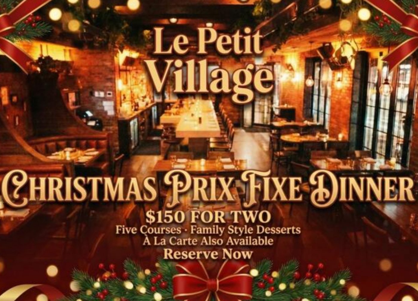 Le Petit Village (173 W 4th Street) welcomes Christmas Eve with a warm and elegant five-course prix fixe dinner for two, priced at $150, celebrating classic French holiday traditions in the heart of Greenwich Village starting at 4pm. The seasonal menu opens with French Onion Soup before continuing with pappardelle layered with truffle and wild mushrooms, a comforting Beef Bourguignon served with family-style sides, and festive desserts including Bûche de Noël and mulled wine–poached pears. Designed for sharing and savoring, the experience captures the cozy spirit of a French Christmas, with an à la carte menu also available for the evening. Reserve your french Christmas Eve feast here: https://resy.com/cities/new-york-ny/venues/le-petit-village/events/le-petit-village-christmas-dining-experience-2025-12-24?date=2025-12-15&seats=2
