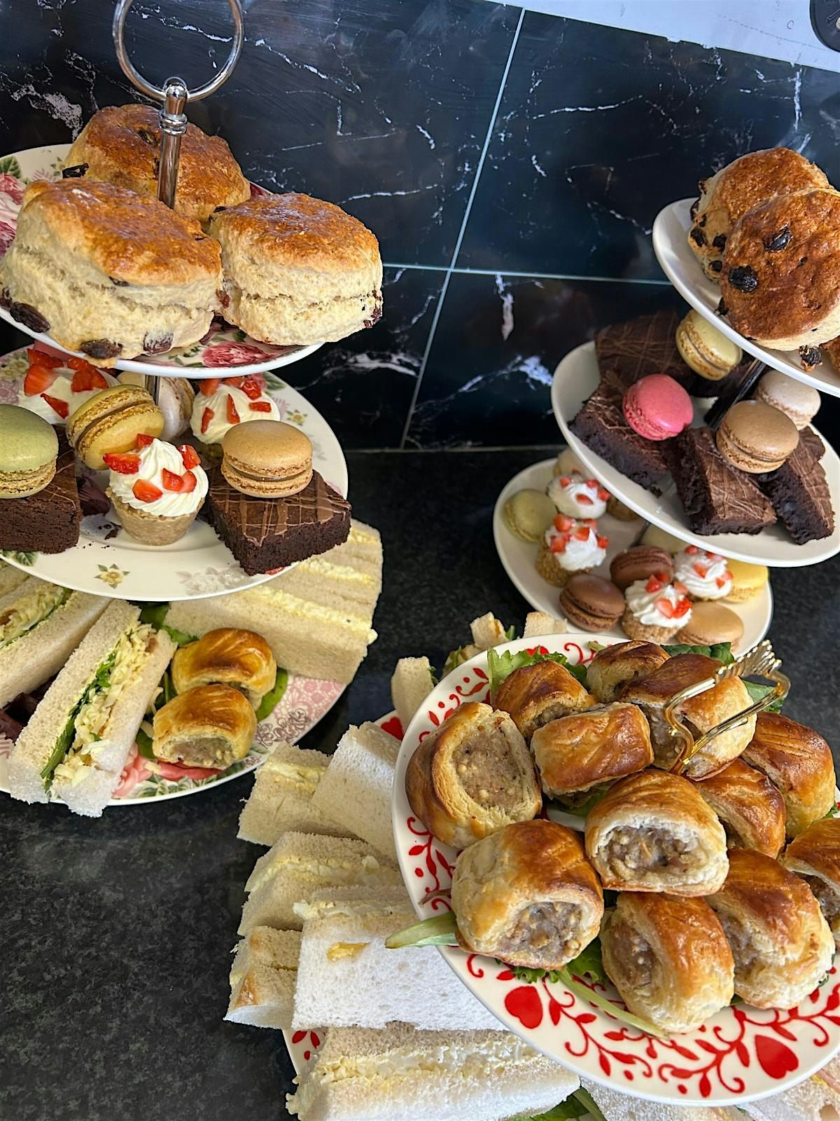Delight in a selection of sandwiches (Gammon & Mustard, Turkey & Cranberry, Cheese & Chutney), homemade pigs in blankets, golden sausage rolls, and freshly baked cranberry scones with clotted cream and Tip Tree jam. Finish with decadent treats like mince pies, yule log, and rich Christmas cake.