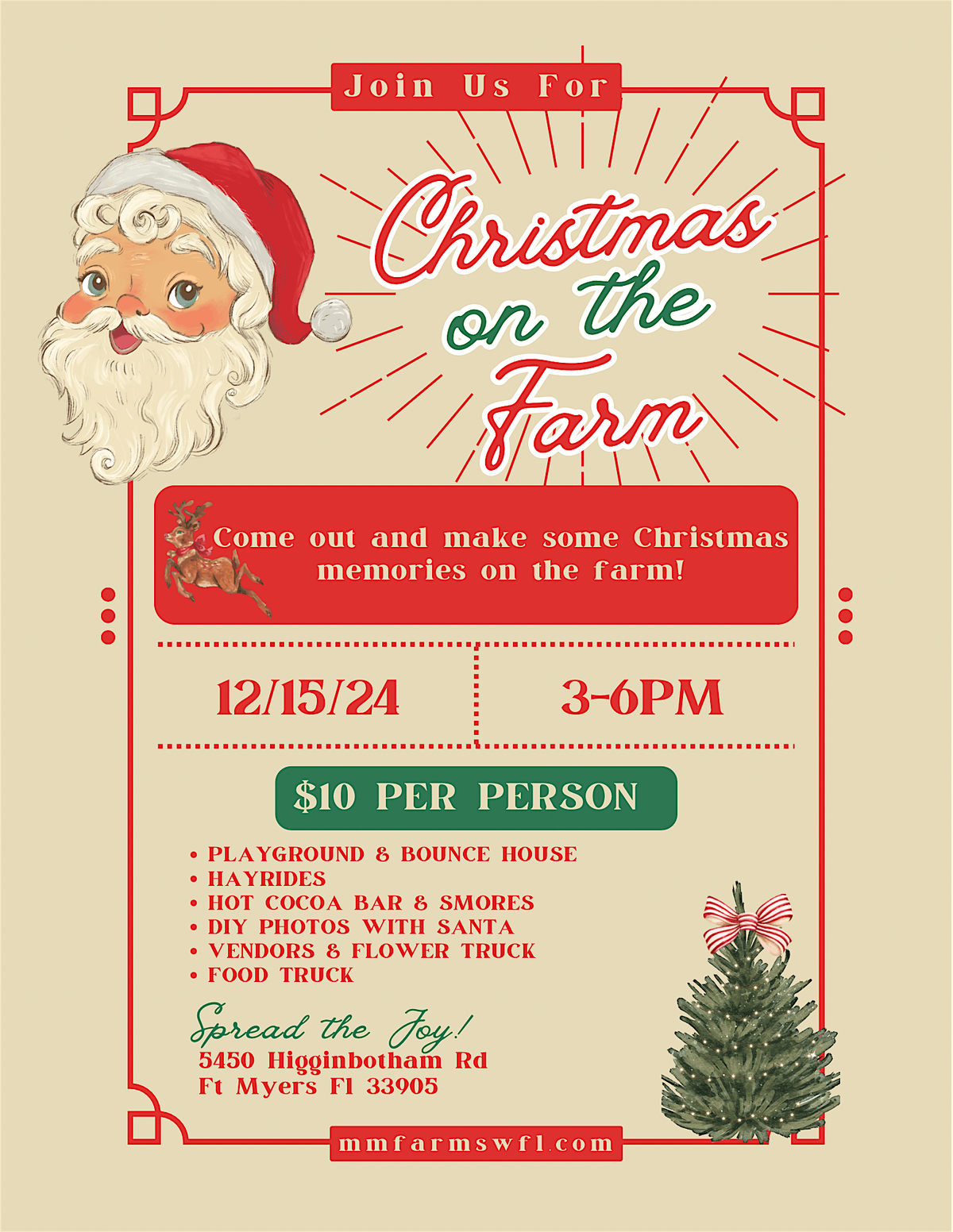 Come join us for a festive celebration at 5450 Higginbotham Rd! Get into the holiday spirit - Bring your family and friends for an afternoon of joy and laughter on the farm. Don't miss out on this special occasion to create lasting memories.