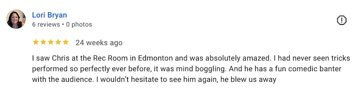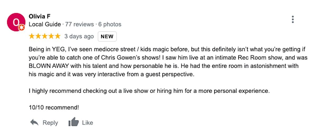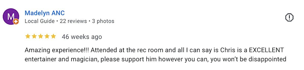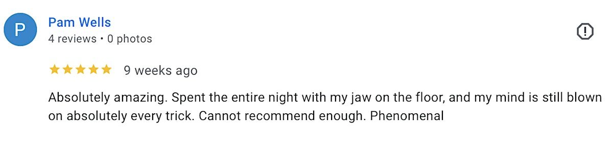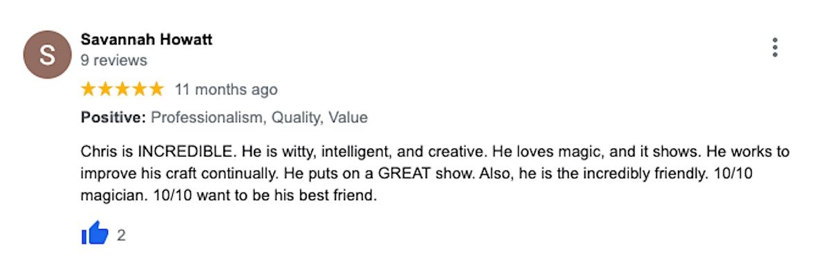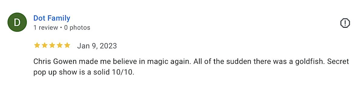 Read REVIEWS here (click on "reviews" on Magician Chris Gowen's Google business profile): https://search.app.goo.gl/xGzEa5g