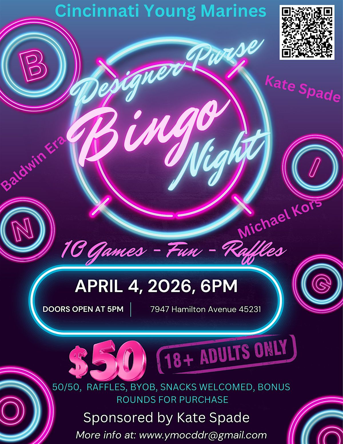 CYM is bringing back Luxury Purse Bingo! Join us for an exciting evening of fun and games at the Cincinnati Young Marines Purse Bingo event! Get ready to win fabulous designer purses while supporting a great cause. This in-person event will take place on Saturday, April 4th, 2026 at American Legion 7947 Hamilton Avenue.