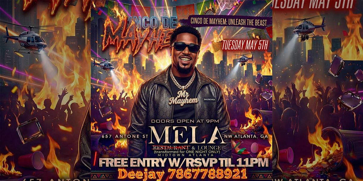 Atlanta — one night only. Mela Restaurant transforms into The Project X Chaos in Midtown for Cinco de Mayhem: Unleash the Beast. Doors open at 9 PM. RSVP before 11 PM for free entry — after that, General Admission is $20 at the door or here. Sections are moving fast: 1 bottle $350, 2 bottles $700, 3 bottles $1,050. Hosted by Mr Mayhem. Produced by Mayhem World Entertainment. RSVP line: Deejay 786-778-8921. Venue: Mela Restaurant & Lounge — 657 Antone St NW, Atlanta, GA. 21+. Dress to stunt.