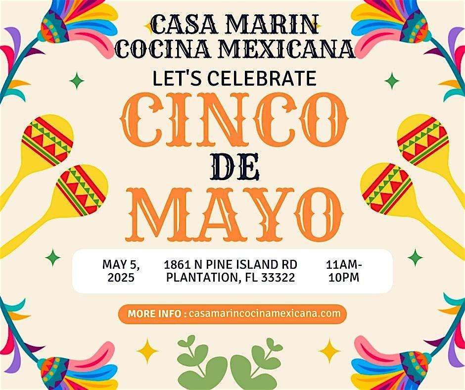 Join us for a fun Cinco de Mayo celebration at Casa Marin Cocina Mexicana! Enjoy great food, lively music, and awesome vibes on May 5, 2026 at 11:00 AM (Eastern Time). Event will have outdoor Food & Drinks. Indoor will be full restaurant service. Bring your friends and get ready to party Mexican style in Plantation, Fl.!