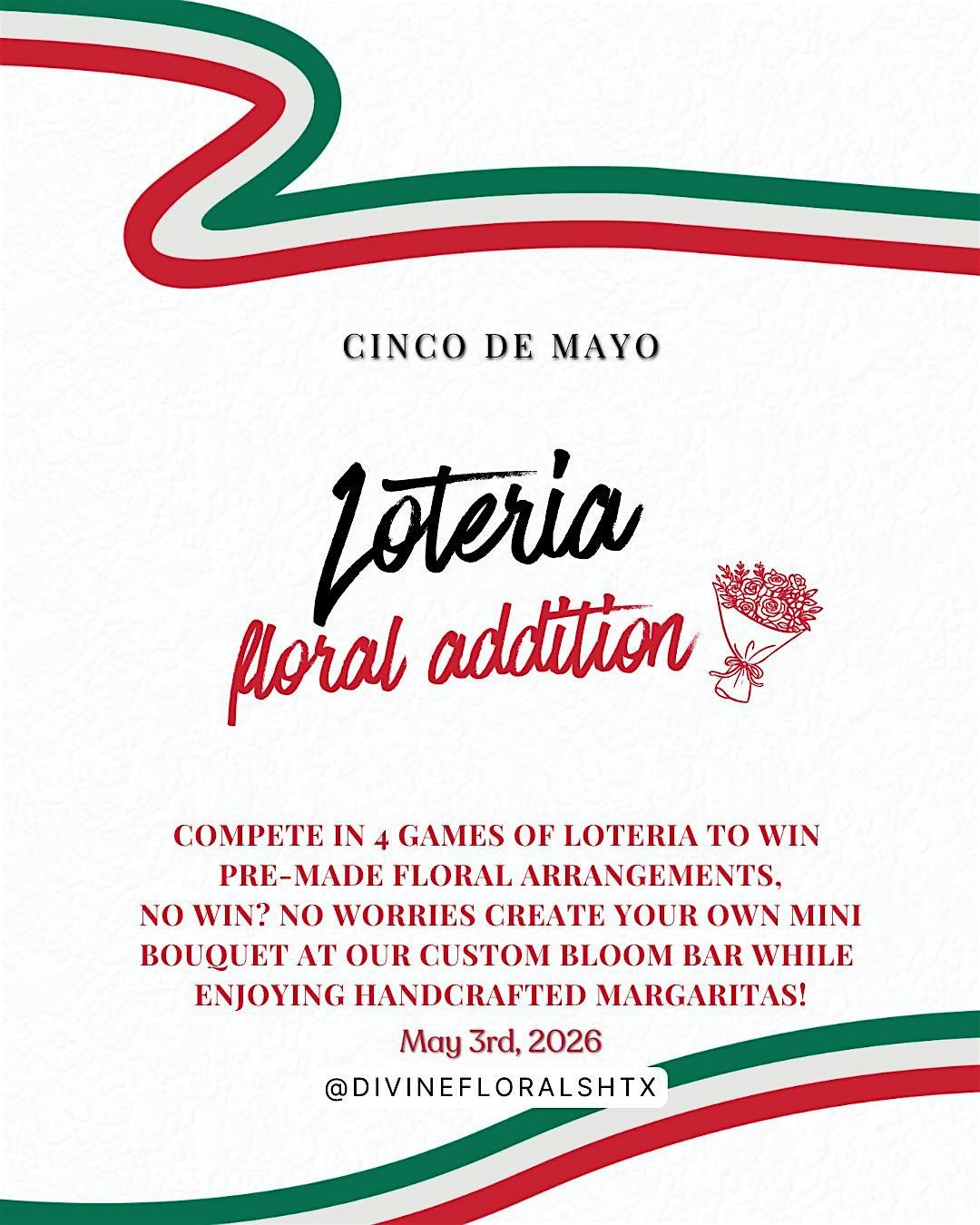 Join us for a fun and festive floral Lotería experience for Cinco de Mayo, where guests will enjoy an evening of games, flowers, and great food and drinks. We will play 4 main rounds of Lotería, and each winning guest will receive a beautiful floral arrangement as their prize. Even if you do not win a game, every guest will still get to enjoy the experience by creating their own bouquet from our floral bar to take home.