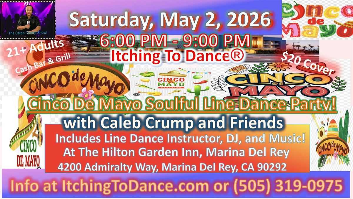 Mark your Calendars and Join us for our fun Cinco De Mayo Soulful Line Dance Party taking place on Saturday, Evening, May 2, 2026 from 6:00 PM to 9:00 PM at the Hilton Garden Inn, located at 4200 Admiralty Way, Marina Del Rey, CA 90292.