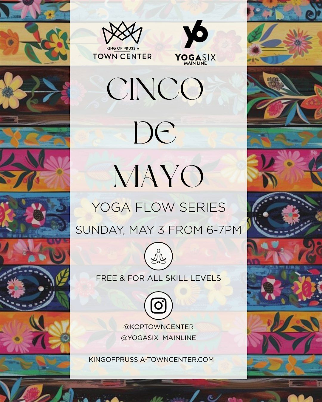 Get ready to celebrate Cinco De Mayo with a relaxing yoga session at King of Prussia Town Center, hosted by YogaSix Main Line! Join us on Sunday, May 3rd, 2026 at 6:00 PM for an evening of yoga under the stars. This in-person event will take place at the beautiful outdoor space in the town center.