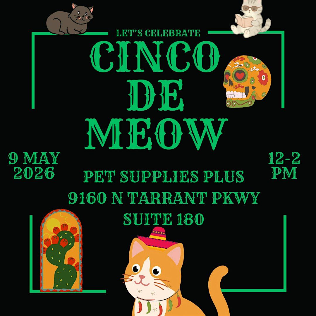 Join us at Pet Supplies Plus North Richland Hills on May 9, 2026 at 12:00 PM (Central Time) for a fun-filled Cinco De Meow celebration! Bring your furry friends and enjoy a purr-fect afternoon with treats, games, and lots of kitty fun. Don’t miss out on this pawsome event where pet lovers unite. Aswell as a cat adoption event from our partners Appolo Support and Rescue.